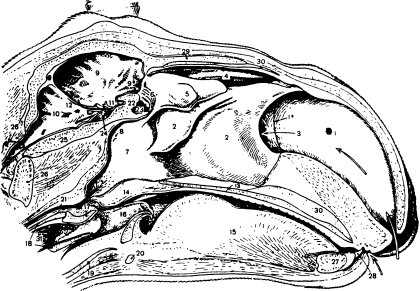 1 - vestibulum nasi; 1 а - граница преддверия; 2 - maxilloturbinale; 3 - вход в носослезный канал; 4 - nasoturbinale (?); 5 - ethmoidotumrbinale (1); 6 - ethmoidoturbinale (П, Ш, IV, V, VI); 7 - pharynx (pars nasalis); 8 - вход в евстахиеву трубу; 9 - полость черепа (область большого мозга); 9а - область обонятельной луковицы; 10 - область мозжечка и ствола мозга; 11 - canalis opticus; 12 - tentotentorium cerebelli; 13 - palatum durum; 14 - palatum molle; 15 - язык; 16 - epiglottis; 17 - cartilago arytaenoides; 18 - cartiago cricoidea; 19 - cartiago thyreoi- dea; 20 - os hyoideum; 21 - pharynx (pars laryngiae); 22 - os praespenoidale; 23 - sinus sphenoi- dalis; 24 - sinus cavemosus; 25 - os occipilale; 26 - atlas; 27 - mandibula; 28 - нижний резец; 29 - os frontonasale; 30 - хрящ перегородки носа; 31 - область голосовой щели.