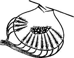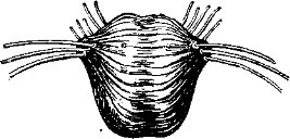 У так называемой клубчатой мшанки (рис. 103) сходство с полипами выражается в том, что у нее из ветвящихся трубочек, составляющих колонию, выступает венчик щупалец, подгоняющих пищу к ротовому отверстию.