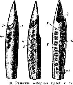 стороне тела, позади ротового отверстия возникает первая, а затем последовательно еще 14 жаберных щелей, позднее перемещающихся на правую сторону. На правой стороне дорзальнее переместившихся щелей прорываются 8 новых жаберных щелей. Далее нижний (ранее образовавшийся) ряд щелей вновь смещается на брюхо, при этом число жаберных щелей также сокращается до 8, и потом на левую сторону. Одновременно ротовое отверстие перемещается на брюшную сторону, и личинка становится симметричной. К этому времени прорывается анальное отверстие, а на дне глотки формируется эндостиль, после этого личинка начинает питаться. Число жаберных щелей увеличивается за счет прорыва новых жаберных отверстий и деления образовавшихся щелей на две выростом их верхней стенки (рис. 18). По бокам тела, над жаберными щелями образуются продольные выросты — метаплевральные складки. Разрастаясь книзу и навстречу друг другу, они смыкаются под брюшком животного, образуя атриальную полость. В виде слепых выростов стенок тела у верхней части глотки возникают нефридии, позже прорывающиеся в атриальную полость.