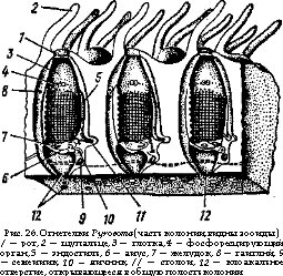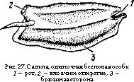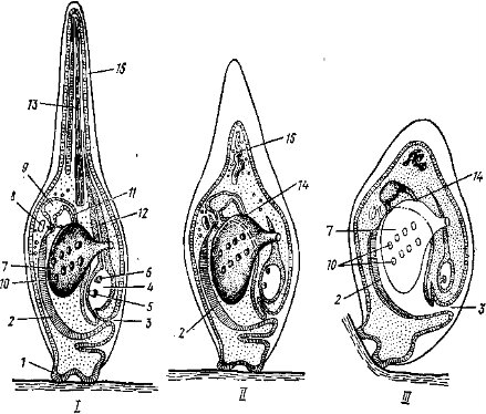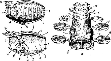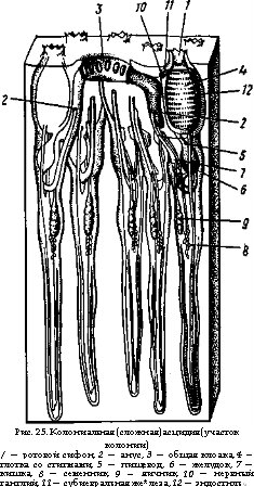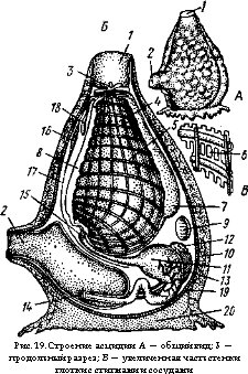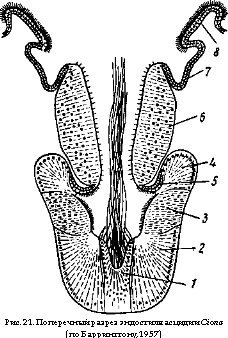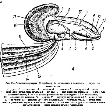 Резко сужаясь на заднем конце, глотка переходит в относительно короткую кишку (см. рис. 12), заканчивающуюся анальным отверстием. От ее начальной части, сразу же за глоткой, отходит направленный вперед печеночный вырост; его стенки выделяют пищеварительные ферменты. Переваривание пищевых частиц происходит как в полости печеночного выроста, так и по всей длине кишечника (рис. 16, Б). Большой объем фильтруемой воды обеспечивает получение достаточного количества пищи при таком пассивном характере питания.
