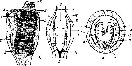 Б — кровеносная система: 1 — приносящие жаберные артерии, 2 — выно