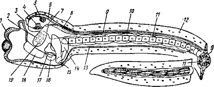 I — брюшная мускулатура. 2 — плавниковая камера, 3 — жаберная дужка, 4 — брюшная аорта, 5 — ротоглоточная полость, 6 — атрнальиая полость, 7 — нотохорд (хорда), 8 — целом, 9 — кожа, 10 — эндостнль, И — печеночный вырост, 12 — гонада, 13 — нервная трубка (спннной мозг), 14 — мномер, 18 — миосепта, 16 — невроцель, 17 — глазки Гессе, 18 — корни спннной аорты, 19 — наджаберная борозда, 20 — кишечная трубка