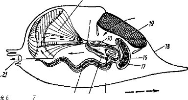 На этой стадии в возрасте около суток зародыш разрывает оболочку яйца и выходит в воду в виде личинки длиной около 3 мм. Она плавает в толще воды с помощью покрывающих тело ресничек. Через 30—36 ч после вылупления на левой стороне переднего конца тела образуется углубление, в которое позже прорывается полость кишечника; так асимметрично закладывается ротовое отверстие (рис. 18). На брюшной