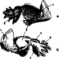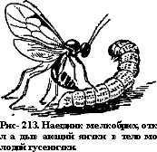 Когда насекомое убито, паук либо об- волакцвает его паутинной тесьмой и оставляет в таком спе лену том виде «про запас» (рис. 161), либо, если он голоден, сразу принимается за еду. Тут паук пускает в дело свои нижние челюсти. Ими паук не размельчает, а разминает свою добычу, обращая ее внутренности в полужидкую кашицу, которую он всасывает через глотку, так что от съеденного насекомого остается только хитиновая шкурка. Нижние челюсти у пауков снабжены членистыми щупальцами, похожими на ножки, но более короткими.