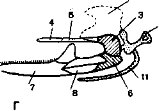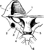 J — резцы (верхние и нижние); 2 — клыки; 3—4 — предкоренные зубы; 5— 6 — хищные зубы (5 — задний , верхний предкоренной, 6 — первый нижний коренной) ; 7 — первый верхний коренной зуб.