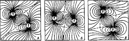 Рис. 138. Силовое поле вокруг двигающихся рыб. А — рыбы взаимно притягиваются; Б — рыбы не влияют друг на друга; В — рыбы взаимно отталкиваются (по Шулей-