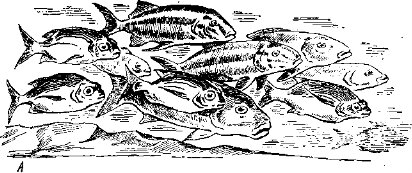 Рис. 127. Характер движения хемихромиса-красавца, вызывающего у мальков реакцию следовании (Л); сбор мальков самкой тиляпии (Б)