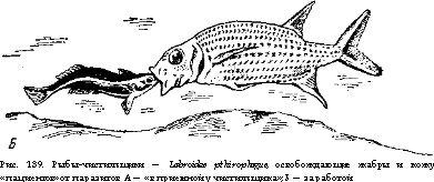 Особо сложные внутривидовые и межвидовые отношения характерны для рыб, населяющих тропические водоемы и коралловые рифы. Им сопутствует огромное разнообразие цветов и рисунков в окраске, развитие звуковой сигнализации и демонстрационного поведения, сложные формы брачного поведения и причудливый гермафродитизм, забота о потомстве (постройка гнезд, охрана икры и молоди). Такая внутривидовая (популяционная) организация упорядочивает использование пространства с его жизненными ресурсами. Примером усложнения взаимоотношений в богатых видами биоценозах тропических морей может служить существование мелких «рыб-чистилыциков», собирающих паразитов с кожи, поверхности глотки и жабр более крупных рыб — «пациентов». Последние иногда собираются к местам обитания «чистильщиков» большими группами, карикатурно напоминающими пациентов, терпеливо ожидающих в приемной «врача» (рис. 139). Сами чистильщики обычно ярко окрашены, что предупреждает нападение на них. Одна из таких чистильщиков — рыбка Labroi- des dimidiatus, обитающая в тропиках Тихого океана, — представляет быстро и обратимо реверсирующего гермафродита, способного сменить состояние самца на состояние самки или обратно в течение нескольких минут. Они живут группами, состоящими из главы — крупного самца и гарема самок, среди которых крупные особи доминируют над мелкими. Самец активным поведением препятствует превращению самок в самцов, но при его гибели доминирующая самка немедленно превращается в самца, занимая его место (Робертсон, 1972). Отношения чистильщиков и обслуживаемых ими крупных рыб повели к появлению своеобразной мимикрии, когда мелкие хищники, по форме и окраске напоминающие чистильщиков, проникают в жаберные полости обманутых «пациентов», вырывая куски жабр.