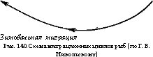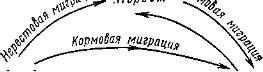 В жизни многих рыб миграции разного типа сменяют друг друга (рис. 140). После нереста, совершая кормовые миграции, рыбы переходят на богатые кормом «пастбища». Часть видов держится на этих кормовых участках более или менее оседло до следующего цикла размножения, другие постоянно перемещаются в поисках пищи. С наступлением сроков очередного размножения начинаются нерестовые миграции. У многих пресноводных и некоторых морских рыб северных и умеренных широт после нагула происходят зимовочные миграции. На местах зимовок в состоянии минимальной активности рыбы переживают зимний период. В пресных водоемах местами зимовок обычно служат наиболее глубокие участки — «ямы». В нижнем течении Урала, Волги и других каспийских рек в «ямах» зимуют осетровые, вобла, лещ, сазан и судак. Рыбы «стоят» неподвижно, близко друг к другу, иногда в несколько слоев. Нагуливающаяся и нерестящаяся в Азовском море хамса осенью уходит на зимовку в Черное море. Дальневосточные камбалы в районе залива Петра Великого нагуливаются в прибрежных районах моря, а на зимовках концентрируются в немногих участках на глубинах около 100—150 м; они выбирают участки с положительной температурой и закапываются в ил, иногда в несколько слоев.