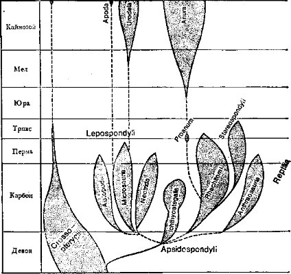 У самок двоякодышащих, как и у хрящевых рыб, длинные яйцеводы —- мюллеровы каналы — открываются в полость тела воронками, а задними концами — в клоаку. У самок осетрообразных \ многоперообразных и амиеобразных короткие и широкие яйцеводы — мюллеровы каналы — воронкой открываются в полость тела около яичников, а задним концом — в мочеполовой синус. У самок панцирни- кообразных и у подавляющего большинства костистых рыб мюллеровы каналы редуцируются; оболочка мешкообразного яичника продолжается в виде короткого протока, открывающегося либо в мочеполовой синус, либо в самостоятельное половое отверстие. Таким образом, в отличие от всех других групп рыб у них зрелое яйцо не выпадает в полость тела, а попадает в полость яичника и по короткому протоку выбрасывается наружу. Лишь у лососевых и немногих других костистых рыб (клюворылообразные, муреновые из угреобразных и др.) зрелые яйца выпадают из яичника в полость тела и выводятся наружу через половые поры или очень короткие яйцеводы с широкой воронкой.