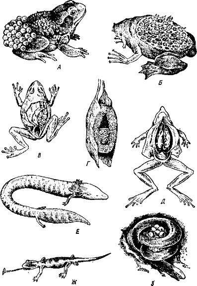 Д — самка сома Aspredo со вдавленными в кожу икринками, Е — самец Apogon (окунеобразные) вынашивает икру во рту (вверху — икринки на разных стадиях