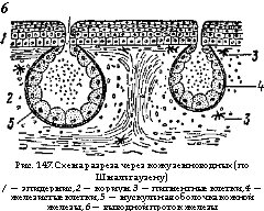 При переходе в море костные рыбы оказались в резко гипертонической среде, грозившей им «иссушением» вследствие потерь воды через кожу и жабры, с мочой и фекалиями (рис. 123, II); некоторое повышение осмотического давления в крови и тканях по сравнению с пресноводными формами (табл. 6, с. 158) предотвратить эти потери не могли. Возник новый механизм регуляции водно-солевого обмена: уменьшилось число клубочков в почках, а у части видов они исчезли полностью (агломерулярные почки); эти рыбы выделяют лишь 0,5—20мл воды на 1 кг массы в сутки. Взамен усиливается роль почечных канальцев, железистые клетки стенок которых увеличили выделение мочевины и других продуктов азотистого обмена. Выделение солей жабрами обеспечено особыми клетками жаберных лепестков. На этой базе водный баланс морских костных рыб был восстановлен тем, что рыбы стали пить морскую воду (от 40 до 200 мл на 1 кг массы в сутки), а избытки солей, поступавшие при этом в организм, выделяли через жабры и с каловыми массами.
