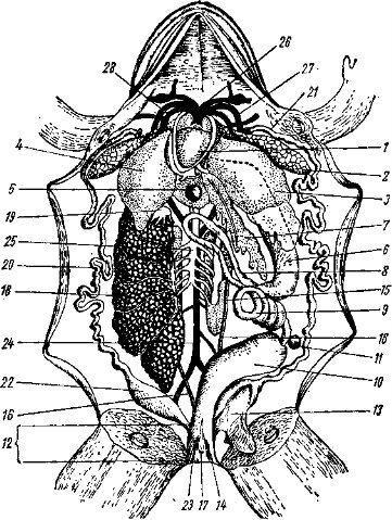 anterior) (рис. 120, 19), собирающие кровь из грудных плавников подключичные вены (v. subclavia) (рис. 120, 20) и задние кардинальные вены (v. cardinalis posterior) (рис. 120, 18) каждой стороны сливаются в соответствующий — левый или правый кювьеров проток (ductus cuvieri), впадающие в венозную пазуху. Вены, собирающие кровь от желудка, селезенки и всего кишечника, сливаются в воротную вену печени (v. portae hepatis); она входит в печень и распадается на капилляры, образуя воротную систему печени. Печеночные капилляры вновь сливаются в вены, объединяющиеся в короткую печеночную вену (v. hepatica) (рис. 120, 24), впадающую непосредственно в венозную пазуху.