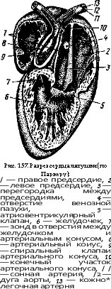 / — венозная пазуха, 2 — предсердие, 3 — желудочек. 4 — артериальный конус, 5 — перегородка предсердия, переходящая в складку верхней стенки желудочка н продолжающаяся в спиральный клапан артериального конуса. 6 — брюшная аорта, 7 — приносящие жаберные артернн, 8 — выносящие жаберные артернн, 9 — кории аорты, 10 — спиииая аорта, // — сониая артерия, 12 — легочная артерия, 13 — легкое, 14 — легочная вей а, 15 — кювьеров проток, 16 — задняя полая веиа; /—V жаберные щели