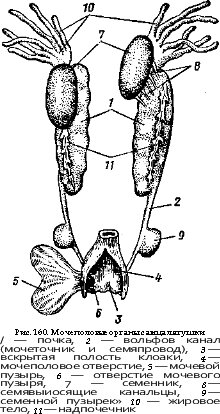 как у хрящевых рыб) части почки или лишь в один (Frotopterus), которые открываются в вольфов канал, на выходе из почки функционирующий как семяпровод и мочеточник. У самцов костистых рыб вольфовы каналы несут только функцию мочеточников (см. рис. 122, 2), а канальцы семенника открываются в семяпровод — новообразование, не связанное с протоками мезонефроса. В нижней части семяпровода иногда образуется расширение — семенной пузырек. Семяпроводы обоих семенников открываются наружу общим половым (рис. 122, 7) или мочеполовым отверстием.