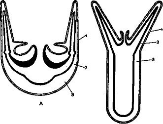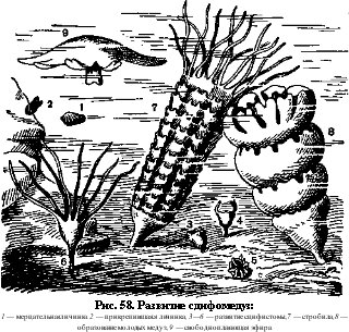 Еще более крупные многокамерные корненожки — нуммулиты (рис. 41,Б) — жили в морях в самом начале новой эры; их закрученные спиралью раковины имели величину 15-копеечной монеты, а некоторые более редкие формы достигали даже