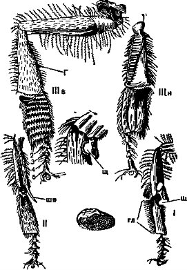 Особенно своеобразное строение имеют у медведки ноги передней пары, обратившиеся (как и передние ноги крота) в очень совершенное копательное орудие (рис. 217). Однако при всей необычности их формы мы можем различить на них те же самые части, что и на типичных бега- тельных ногах таракана. Мы увидим, что широкая, оканчивающаяся несколькими зубцами «ладонь» медведки, запоминающая и по форме и по функциям копатель- ную ладонь крота, в действительности представляет собой сильно расширенную и укороченную голень, а сочлененные с ней отростки, напоминающие пальцы (не смешивайте их с неподвижными зубца,-