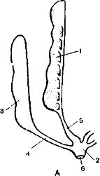 Удалим печень и начнем осторожно распутывать кишечник, стараясь его не оборвать (здесь нам придется удалять белые прослойки жпра, которые тянутся вдоль кишки и между ее петлями). За желудком идет передняя кишка, от которой у многих видов, точно пальцы на перчатках, отходит несколько отростков, или кишечных придатков, куда тоже набивается пища и обрабатывается пищеварительными соками. За передней кишкой начинается средняя кишка. Она образует в теле петлю, а затем вытягивается вдоль тела и переходит в заднюю кишку, которая оканчивается анальным отверстием. В изгибе средней кишки мы найдем продолговатую красную селезенку; этот орган уже не имеет прямого отношения к кишке и к пищеварению: селезенка связана с кровеносными сосудами, и в ней происходит переработка и образование кровяных телец.