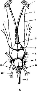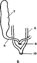 А — самца; В — самки; 1 — почка; 2 — мочеполовой синус; 3 — семенник; 4 — семепровод; 5 — вольфов проток: 6 — мочеполовое отверстие; 7 — яичник; 8 — яйцевод; 9 — половое отверстие; 10 — мочевое отверстие.