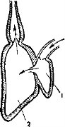 1 — предсердие; 2 — желудочек. Стрелками показано направление кровяного тока. />