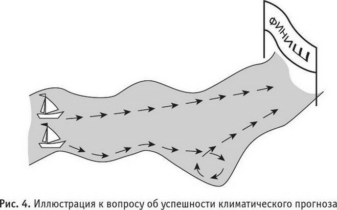 Почему именно 15 дней? Строгое обоснование этого утверждения требует знания основ гидромеханики. Не будем вдаваться в детали и опять прибегнем к аналогии. Каждый из нас, наблюдая за летящим самолетом, Прогноз на каждый следующий день строится исходя из того, что данные за предыдущий день безошибочны (что, разумеется, не так!). Примитивный пример: пусть за первые 4 дня накопилась ошибка в 1 °С, но при прогнозе на пятый день температура за четвертый день считается истинной (т. е. ошибка равна нулю), сам прогноз пятого дня даст свою относительно небольшую ошибку, например 0,3 °С, однако с учетом ошибки, накопленной за предыдущие дни, общая погрешность будет уже 1 + 0,3 = 1,3 °С и т. д.