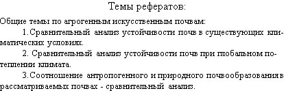 Темы рефератов: Техногенные почвы: определения, распространение, свойства. Методы рекультивации техногенных почв. Современные проблемы техногенеза и эволюции техногенных почв. Место техногенных почв в почвенных классификациях разных стран. Почвы и особенности почвенного покрова техногенных ландшафтов.