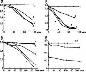 Рис. 17. Характеристика процесса выделения биомассы из культуральной жидкости Р. aureofaciens ИБ 17 (а), Р. putida ИБ 51 (б), Р. aureofaciens ИБ 6 (в) и Az. vinelandii (г) под действием флокулянта гивпан при его содержании: 1 - нативная культуральная жидкость; 2 - 0,1%; 3 - 0,3% ; 4 - 0,5 %; 5 - 0,8%