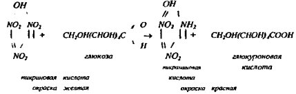 Используют реакцию восстановления пикриновой кислоты (2,4,6-тринитрофенола) в пикрамииовую.