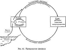 Однако значение микроорганизмов в питании растений фосфором не сводится только к микосимбиотрофии. Свободноживущие микроорганизмы участвуют в процессах минерализации фосфорорганических соединений и способствуют переводу нерастворимых форм фосфора в растворимые. Эти процессы составляют основу превращения фосфора в природе (рис. 61).