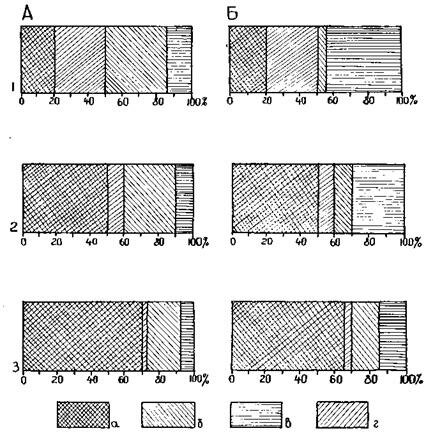 Рис. 22. Соотношение в объемных процентах между твердой (а), жидкой (б), газовой (б) и живой (г) фазами в дерновом горизонте луговой почвы (/), в гумусовом горизонте чернозема (2) и солонцовом горизонте солонца (3) в состоянии предельной полевой влагоемкости (А) и в воздушно-сухом