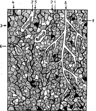 Рис. 23. Сложение и фазовый состав почвы:1 — твердая фаза (агрегаты почвенных частиц); 2 — поры, заполненные воздухом; 3 — крупные поры, заполненные водой; 4 — заполненные водой капиллярные поры; 5 — грибная плесень; 6 — личинки и куколки почвенной фауны; 7 — ход дождевого червя; 8 —корневая система растений, 9 — раковины моллюсков |