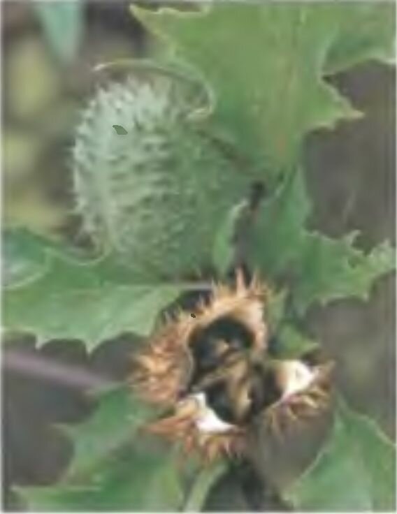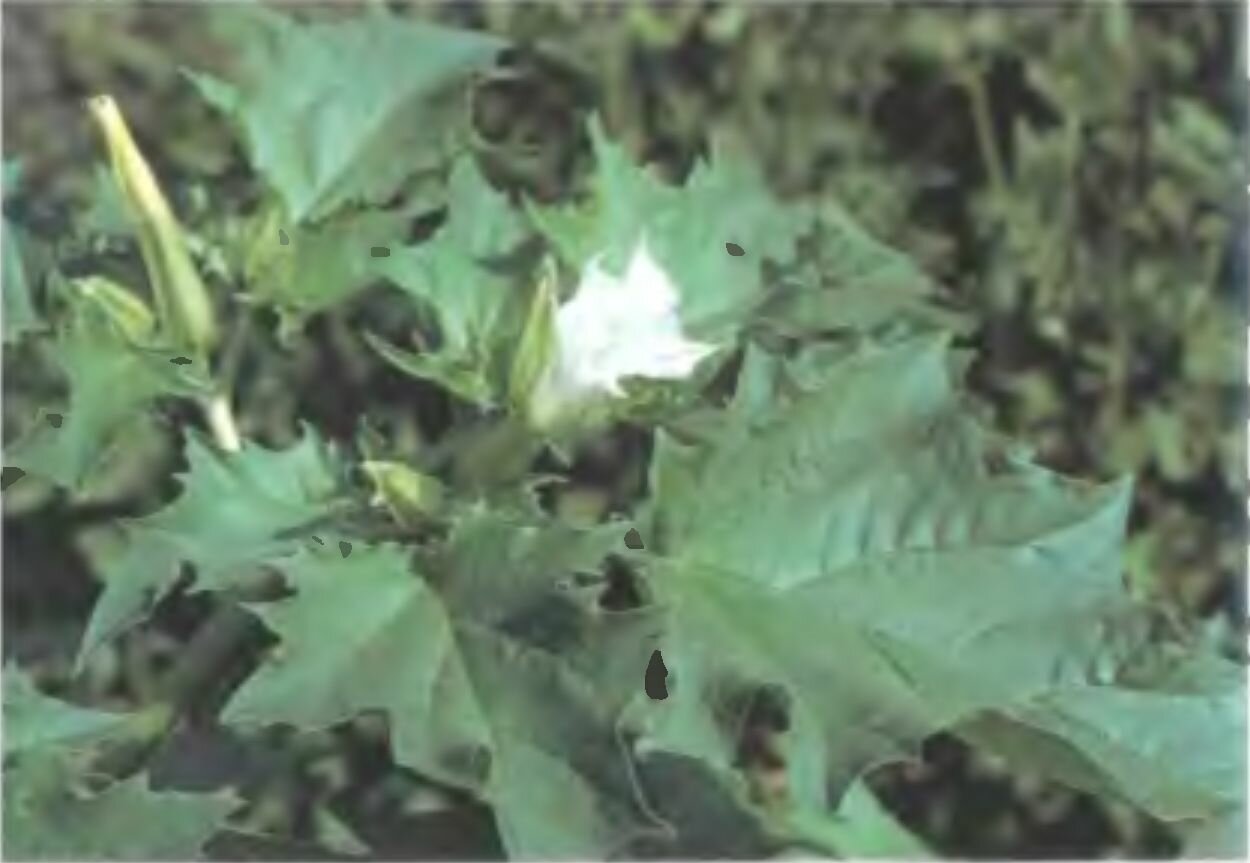 Признаки. Дурман - это сильное однолетнее травянистое растение вы-сотой 30-100 см с яйцевидно-заостренными, неравномерно выемчато- пильчатыми листьями С июня до сентября появляются трубковидные белые или светло-фиолетовые одиночные цветки Затем на випьчато-раз- ветвленных стеблях с августа до октября появляются плоды Подобно плодам каштана они сначала зеленые и покрыты колючками, размер плодов - приблизительно с лесной орех Созревая, оболочка плода становится коричневой и раскрывается четырьмя створками, она содержит большое количество мелких почковидных темно-коричневых семян Вое растение распространяет неприятный залах