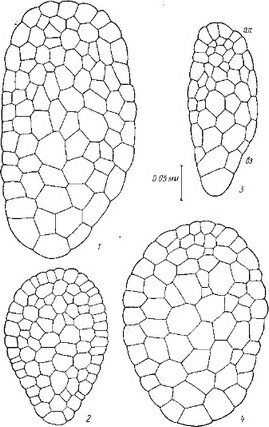 Сем. Triuridaceae. Строение зрелого семени и уровень дифференциации зародышей свидетельствуют о том, что проросток Sciaphila развивается из базального полюса проэмбрио.