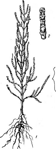 - Эугалофиты (солянки). В основном это обитатели солончаков или солончаковых участков засоленных комплексов. Примеры — солерос европейский (Salicornia еи- гораеа), сарсазан шишковатый (На- locnemum strobilaceum), виды родов Salsola, Petrosimonia, Suaeda, Obio- ne и др. Характерен внешний облик этих растений. Некоторые из них имеют суккулентные черты (рис.