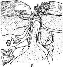 В сухом состоянии перевеянные пески рыхлы, сыпучи и совершенно бесструктурны. Примеры последствий подвижности песка хорошо известны из истории среднеазиатских цивилизаций (погребение целых городов, пахотных массивов и т. д). В песчаных пустынях или на приморских дюнах непрерывный перенос песка ветром — фактор не эпизодический, а постоянный, и без приспособления к нему растения не могут существовать. Постоянная угроза для пустынных растений (не только мелких травянистых, но и крупных деревьев и кустарников) — частичное или полное погребение их под толщей песка (рис. 142). Существует и противоположная опасность — выдувание и оголение корней, грозящее им и всему растению засыханием (рис. 143). В качестве защиты у пустынных псаммофитов выработалась способность при погребении образовывать придаточные корни от ствола на любой высоте. Так, кустарники из рода джузгун (Calligonum) при засыпании развивают сильные придаточные корни на стеблях выше корневой шейки, а быстрый рост стеблей дает им возможность обогнать наступающие барханы. Часто от большого куста 3— 4-метровой высоты на поверхности бархана остается только щетка зеленых побегов, но благодаря придаточным корням куст продолжает жить. При отступлении песка придаточные корни обнажаются и остаются свидетелями бывшего уровня погребения — иногда в середине кроны или даже близ ее вершины (рис. 143). У пустынных злаков из рода Aristida (A. karelini, A. pennata) при раскопках видно несколько ярусов корней, располагающихся друг