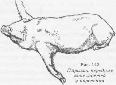 При миелите шейной части спинного мозга возникает паралич диафрагмы из-за выпадения функции N. ріігепісив с расстройством дыхания. При поражении спинного мозга на уровне шейно-грудного отдела наблюдают вялый паралич передних конечностей и мышечную гипотонию, гипо- или арефлексию передних конечностей из-за повреждений нейронов плечевого сплетения, выпадение третьего века, синдром Горнера. Поражение поясничного отдела проявляется нарушением ходьбы, спастическимпараличом задних конечностей (рис. 139) или атаксией, гиперстезия сменяется анестезией и анальгезией. Рефлекторная возбудимость исчезает, появляется недержание мочи, на^ блюдается отсутствие анальных и около- анальных рефлексов.