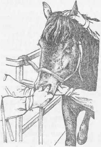 Перед введением зонда строптивых лошадей фиксируют за уши, губу или накладывают закрутку. Зонд для лошадей представляет собой эластичную резиновую трубку длиной 160—225 см, наружным диаметром 18 мм и внутренним просветом 12—14 мм. Вводят его через носовые ходы (рис. 15). Перед этим зонд проверяют на проходимость воды, дезинфицируют и затем смазывают вазелином. Для определения местонахождения на зонде делают пометки: первая — показатель расстояния от крыла ноздри до глотки (измеряют