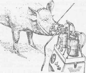 Крупных с-виней зондируют после фиксации за верхнюю челюсть при стоячем положении, поросят и подсвинков — на фиксационном станке. Вставленный в рот зевник фиксируют капроновой тесьмой, охватывая обе челюсти, и прочно завязывают в области затылка. Простерилизованный и смазанный вазелином зонд вставляют в отверстие зевника и продвигают в сторону глотки, пищевода и желудка. Содержимое желудка отсасывают с помощью шприца объемом 100-250 мл и специальной установки ОХ-Ю (рис. 16).
