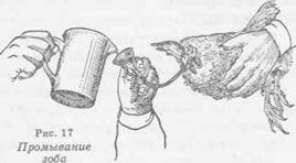 Зоб у птиц промывают с помощью резиновой трубки диаметром 5—7 мм и длиной 40—50 см или специальным зондом из полизтиленовой трубки с овальной головкой и отверстиями на конце (рис. 17). Помощник левой рукой удерживает птицу, а правой — открывает клюв. Оператор вводит подготовленный зонд в рот и далее в зоб. В наружный конец зонда вставляют воронку, через которую заливают 0,5% -й раствор соды в дозе 100-150 мл. После его введения содержимое зоба осторожно разминают, зонд вытаскивают и одновременно опускают голову птицы вниз при открытой ротовой полости. Легкий нажим на зоб по направлению к клюву обусловливает освобождение зоба от содержимого. При необходимости промывание повторяют.