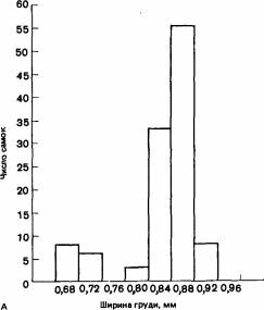 Рис. 14.1. Ширина груди у репродуктивных самок (А) и у маток (Б) Pseudomyrmex venefica, обитающих в колючках акации. (Janzen, 1973.)