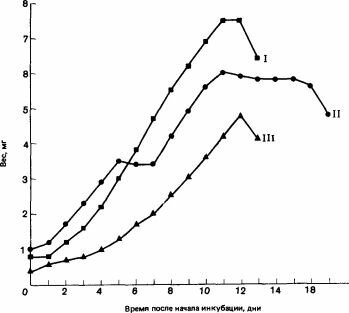 Рис. 14.2. Рост личинок после зимовки. Некоторые из них развились в репродуктивных самок (Г), одна - в микрогину (II), а некоторые-в рабочих особей (III). (По данным Brian, 1955b.)