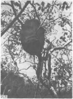 Фото 22. Гнездо медоносной пчелы в естественной полости в стволе дерева. Видны девять сотов неправильной формы, на нижнем краю которых находятся трутневые ячейки. [Фото 21 и 22-J. В. Free.]