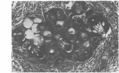 Фото 21. Гнездо шмеля Bombus lucorum. Ячейки образуют скопление, окруженное обрывками растительных тканей из гнезда мыши. Справа лежат пять коконов, с которых шмель соскоблил воск для постройки новых яйцевых ячеек.