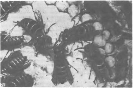 Передача корма от одних рабочих особей Vespula sp. другим на соте, ячейки которого содержат куколок и запечатаны шелком и картоном. Обратите внимание на личинок, расположенных по периферии.Фото 29. Рабочие особи медоносной пчель. образующие „свиту“ вокруг своей матки. Вс. они обращены к матке головами, и их усик: вытянуты вперед. [Фото 28 и 29-J. В. Free.