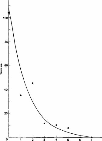 Рис. 11.4. Зависимость числа репродуктивных яиц, откладываемых рабочими особями Myrmica rubra, от числа дней в неделю, которые их самки проводят в гнезде. (Brian et al., 1981.)