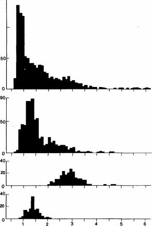 У муравья Atta cephalotes, обитающего в тропическом дождевом лесу, распределение рабочих особей по размерам в выборках, взятых из гнезд, дает кривую логнормального распределения (рис. 3.5) (Stradling,