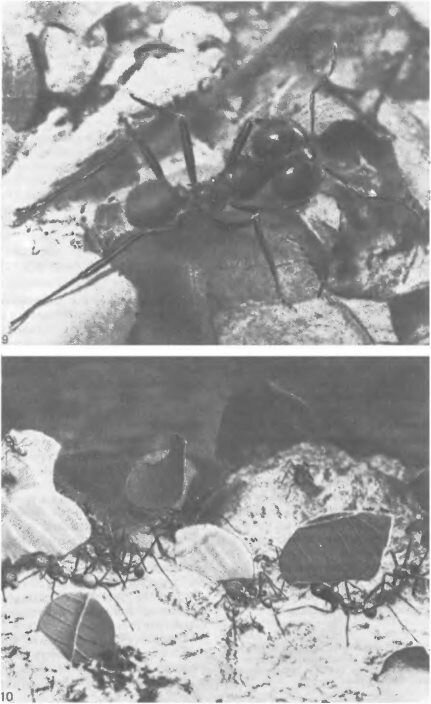листьев. Очень мелкие рабочие, разрезая лист, влезают на него и слизывают выделяющийся при этом сок; нередко они возвращаются в гнездо на кусочке листа, который тащат другие рабочие. Как показал Wilson (1980), более крупные рабочие разрезают более жесткие листья. [Фото 9 и 10-D. J. Stradling.]