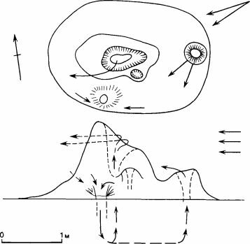 Рис. 7.2. Направление ветра и циркуляция воздуха в гнездовом холмике Macrotermes subhyalims. (Weir, 1973.)