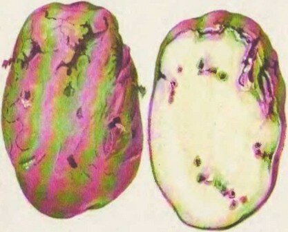 На разрезе пораженных клубней видны красновато-коричневые пятна различной величины и формы В отличие от фитофтороза пятна не имеют выхода к периферии клубня.