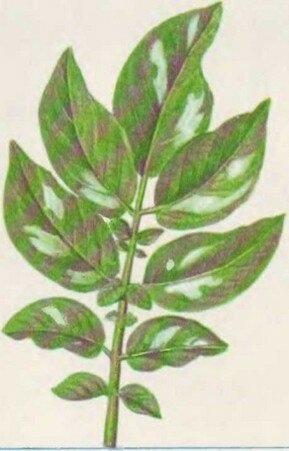 На долях листьев появляются бурые пятна отмершей ткани по краям и у кончика, а в дальнейшем и между жилками. Рост листьев прекращается.